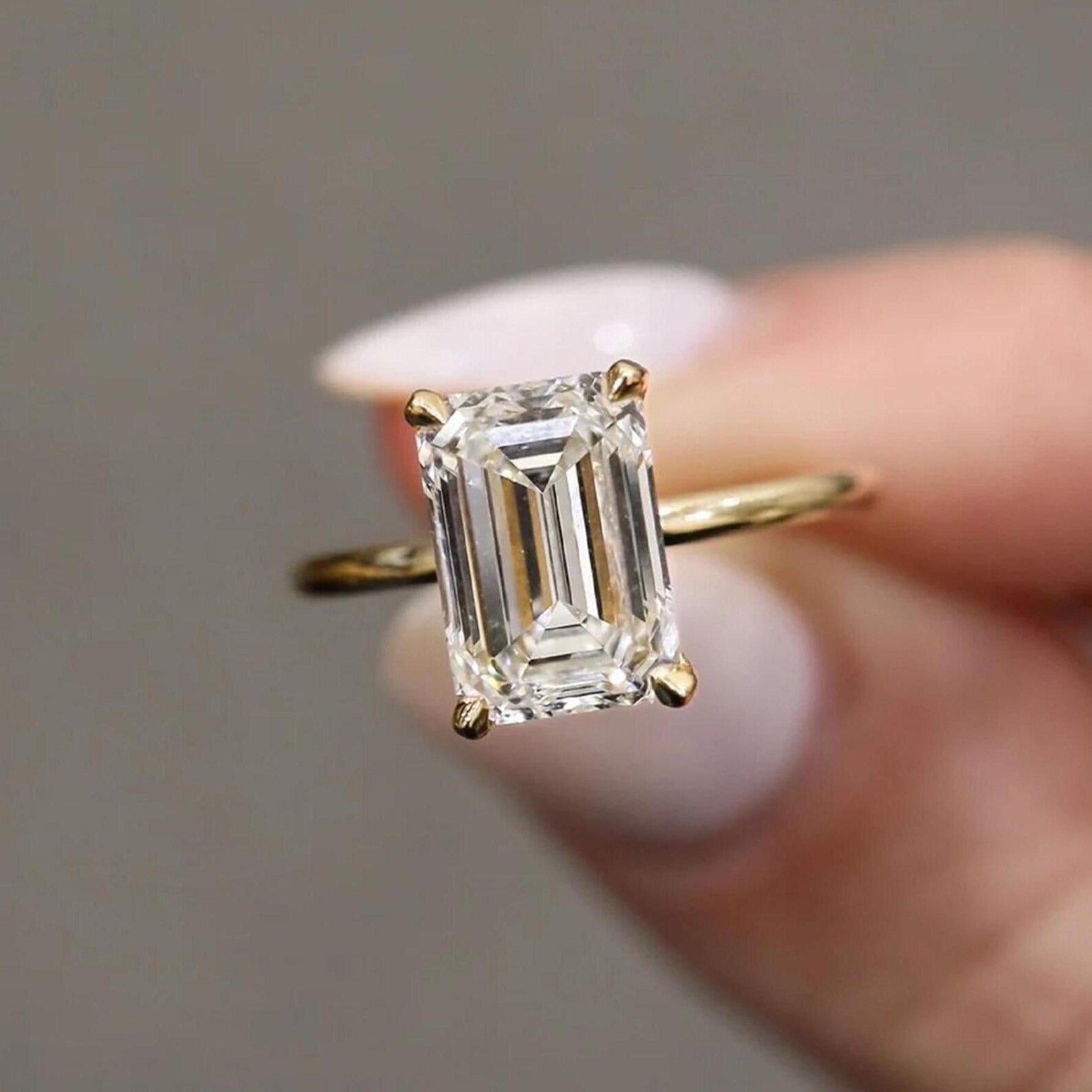 4 CT Emerald Cut Moissanite Engagement Ring Emerald Cut Solitaire Lab Grown Diamond Ring 14K Solid Gold Ring For Women Hidden Halo Ring.