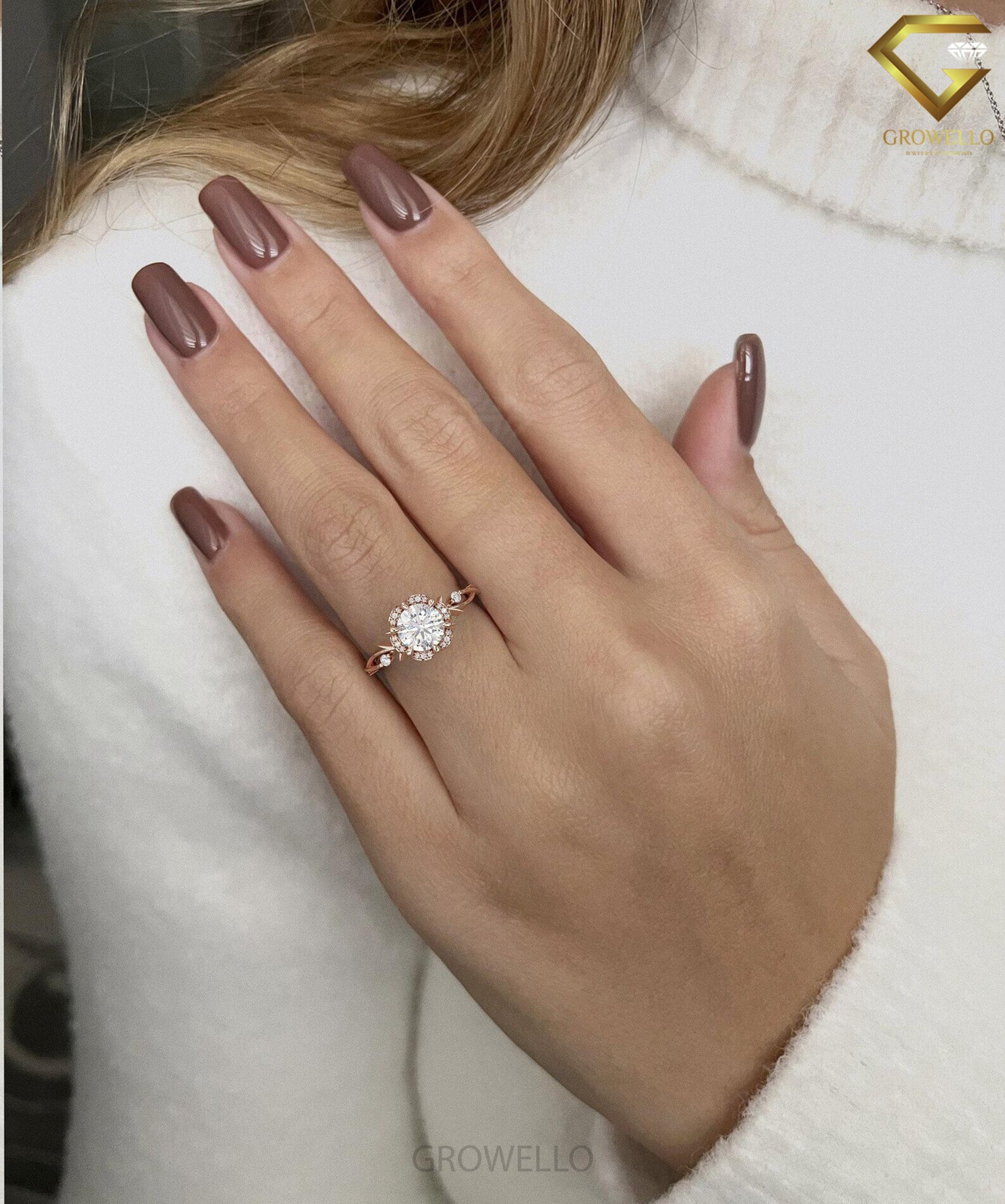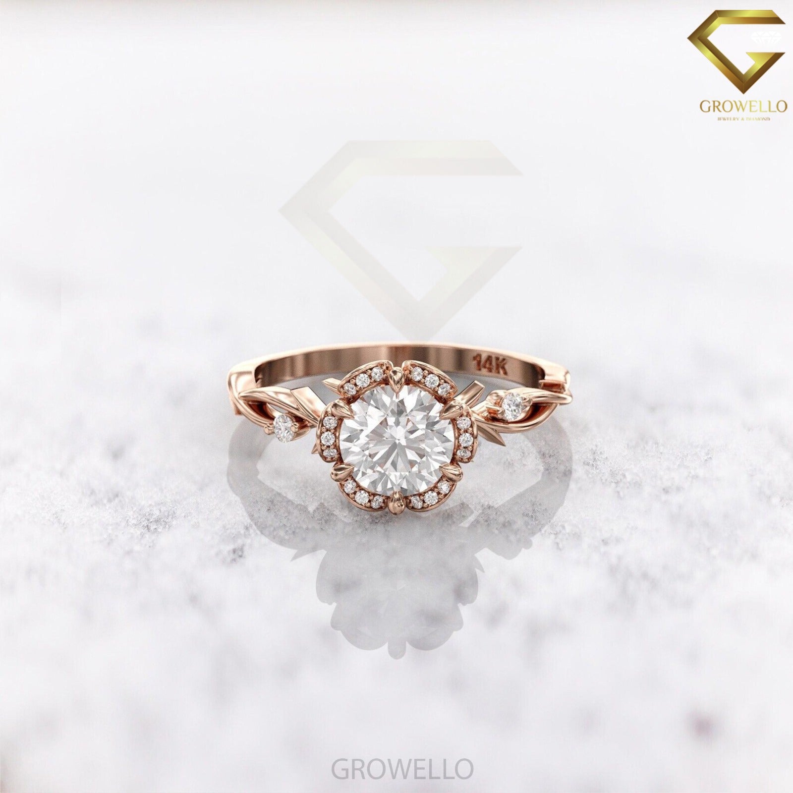 2ct round floral halo ring, vine shank, solid gold, lab-grown diamond or moissanite
