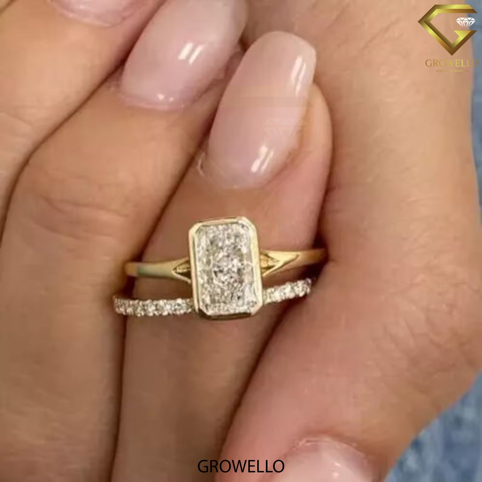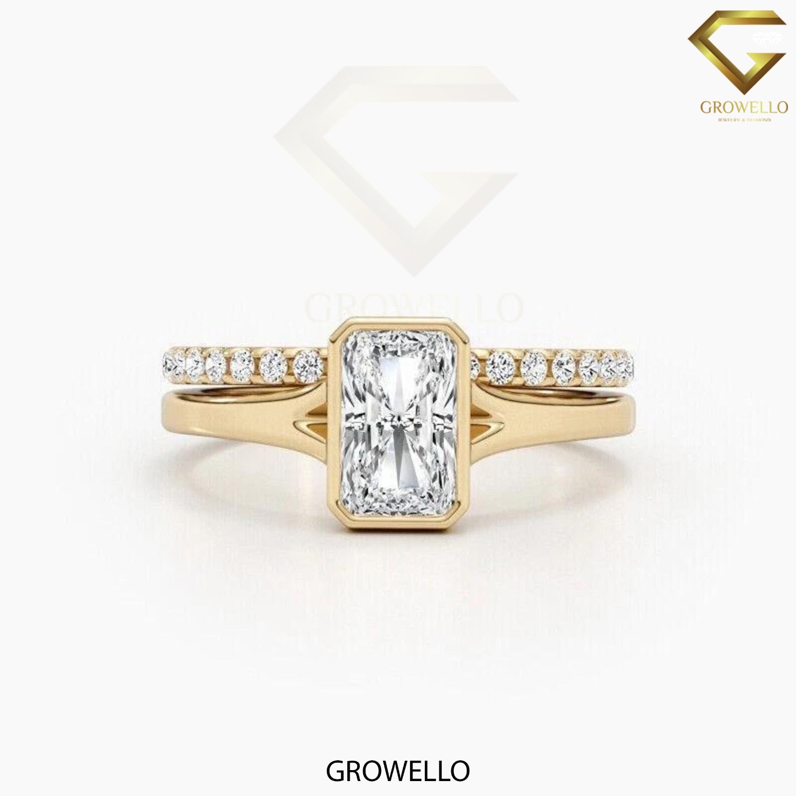 2 CT radiant bezel ring, split-shoulder with pave shadow band, solid gold, lab-grown diamond or moissanite