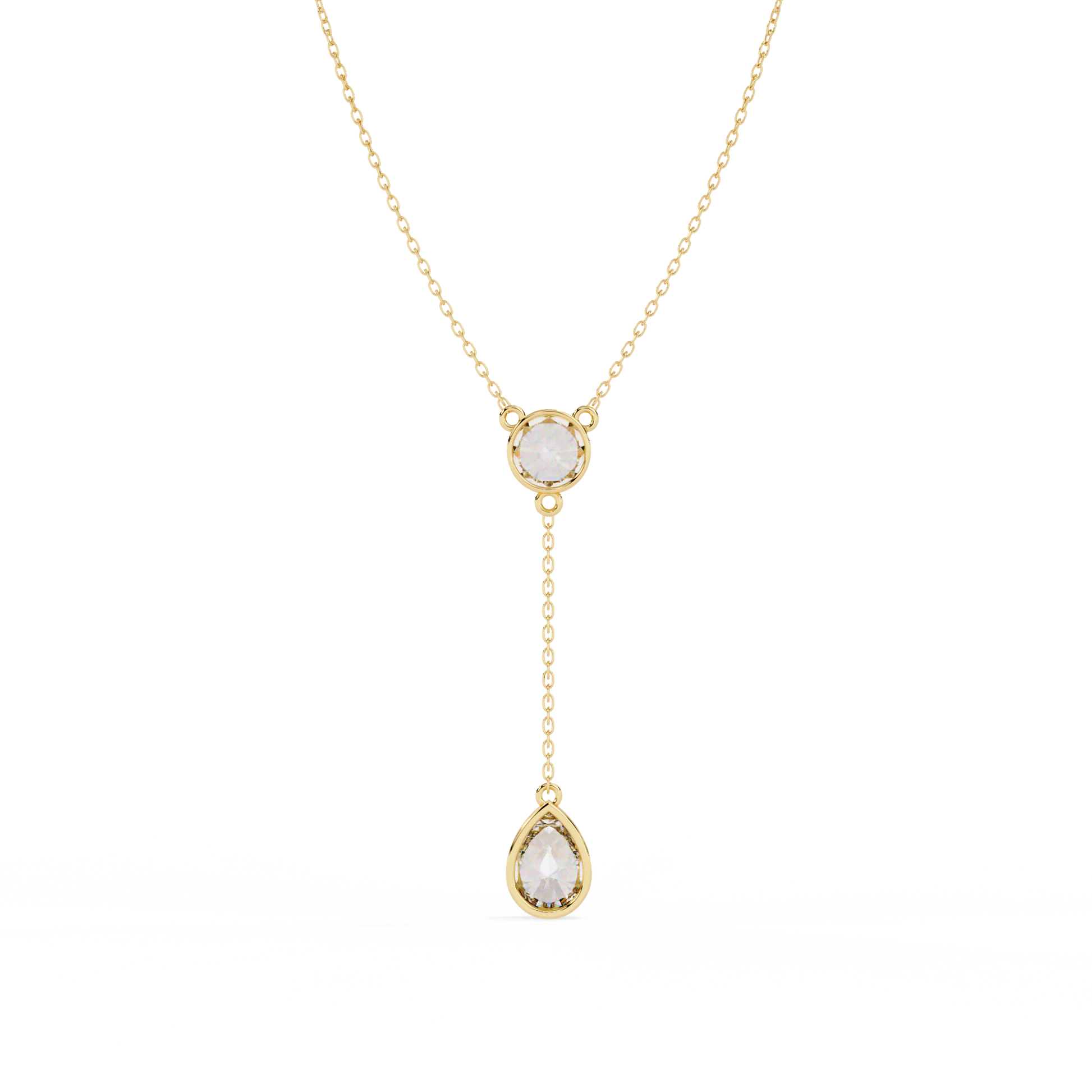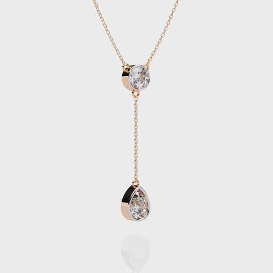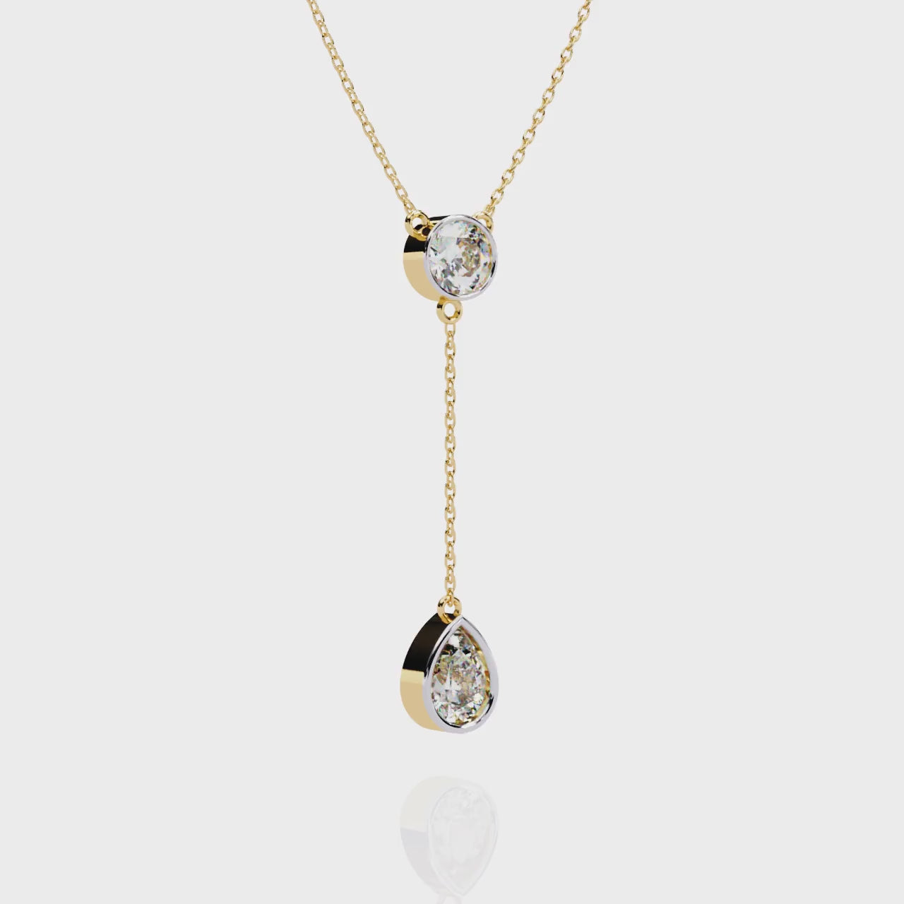 A clean, modern Y-necklace featuring two bezel-set stones (top round + bottom pear) linked by a sleek drop chain. Minimal from afar, high sparkle up close—made to layer or stand alone.