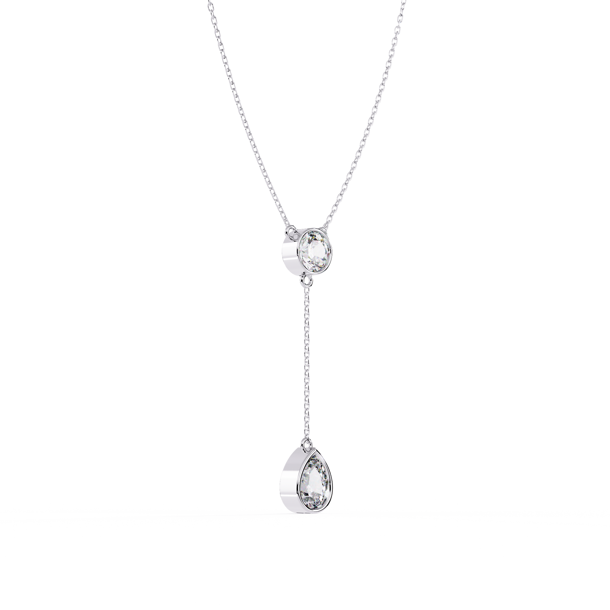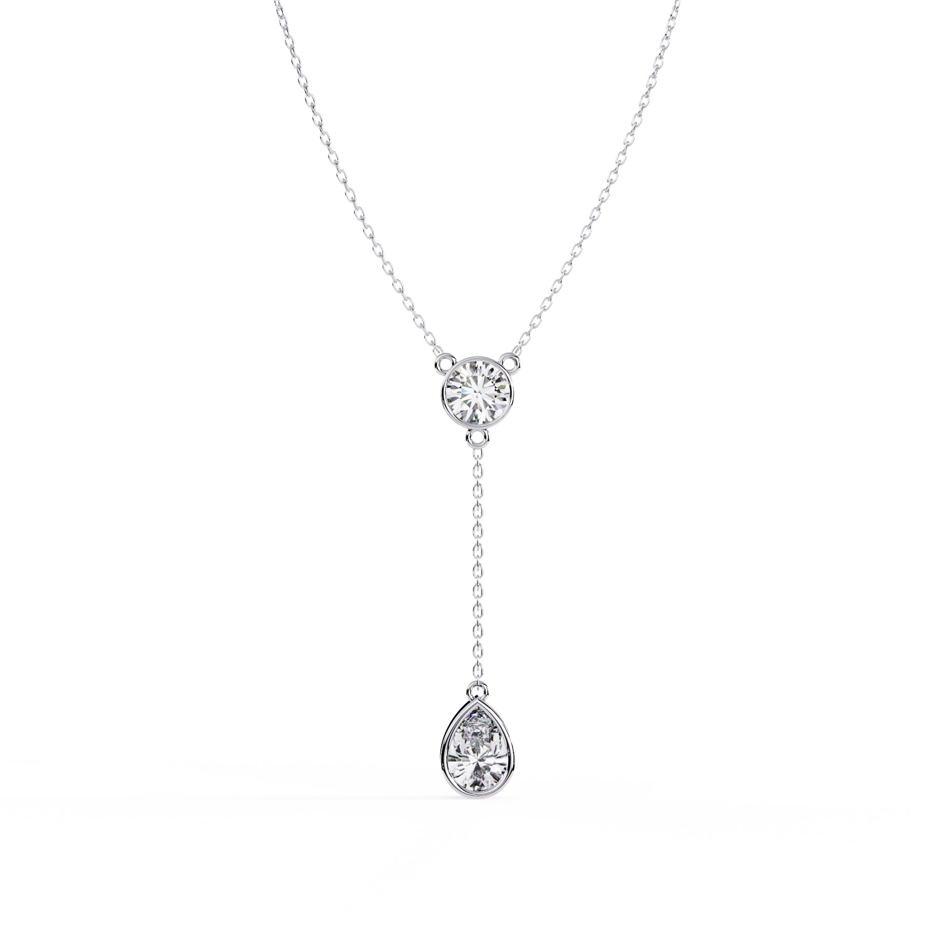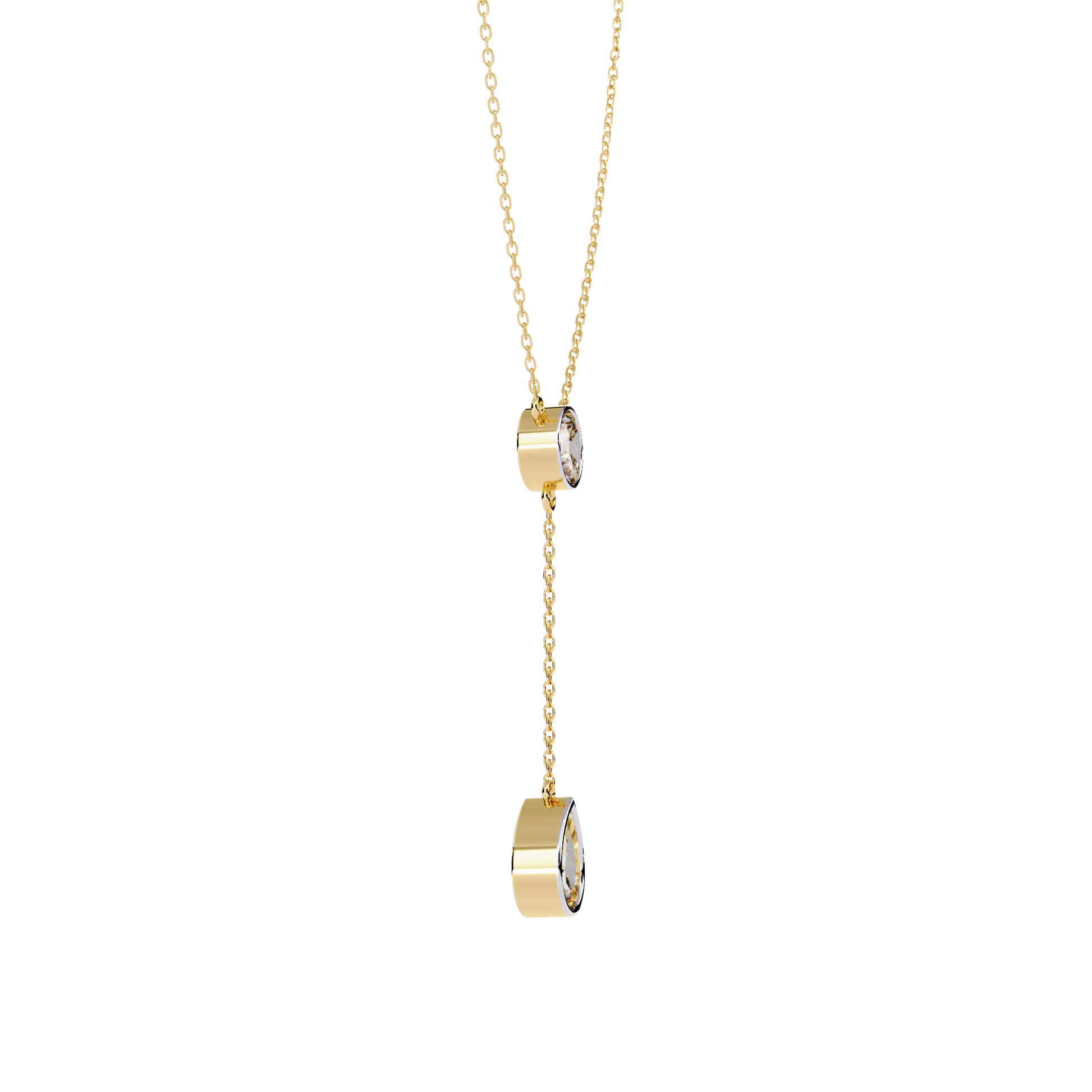 A clean, modern Y-necklace featuring two bezel-set stones (top round + bottom pear) linked by a sleek drop chain. Minimal from afar, high sparkle up close—made to layer or stand alone.