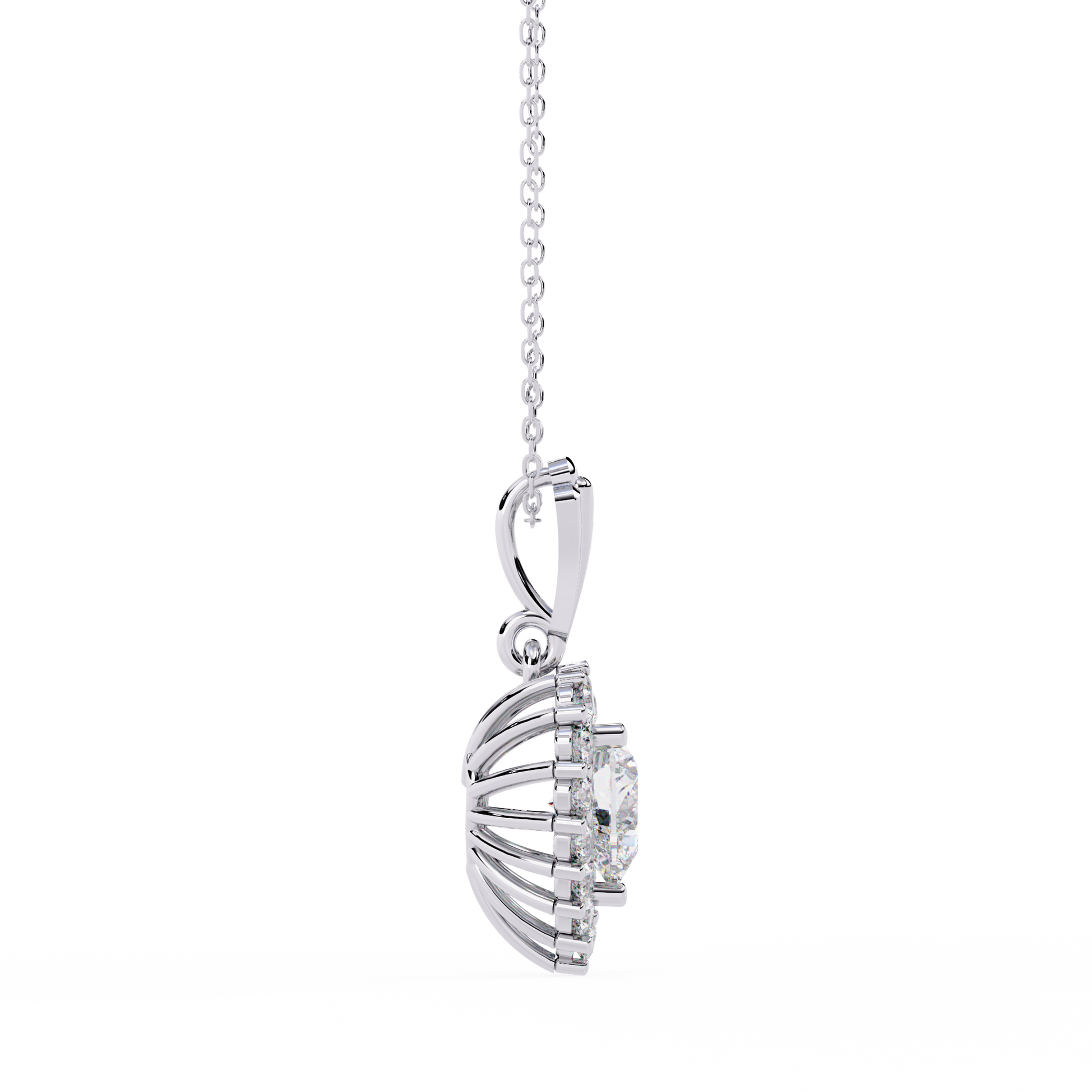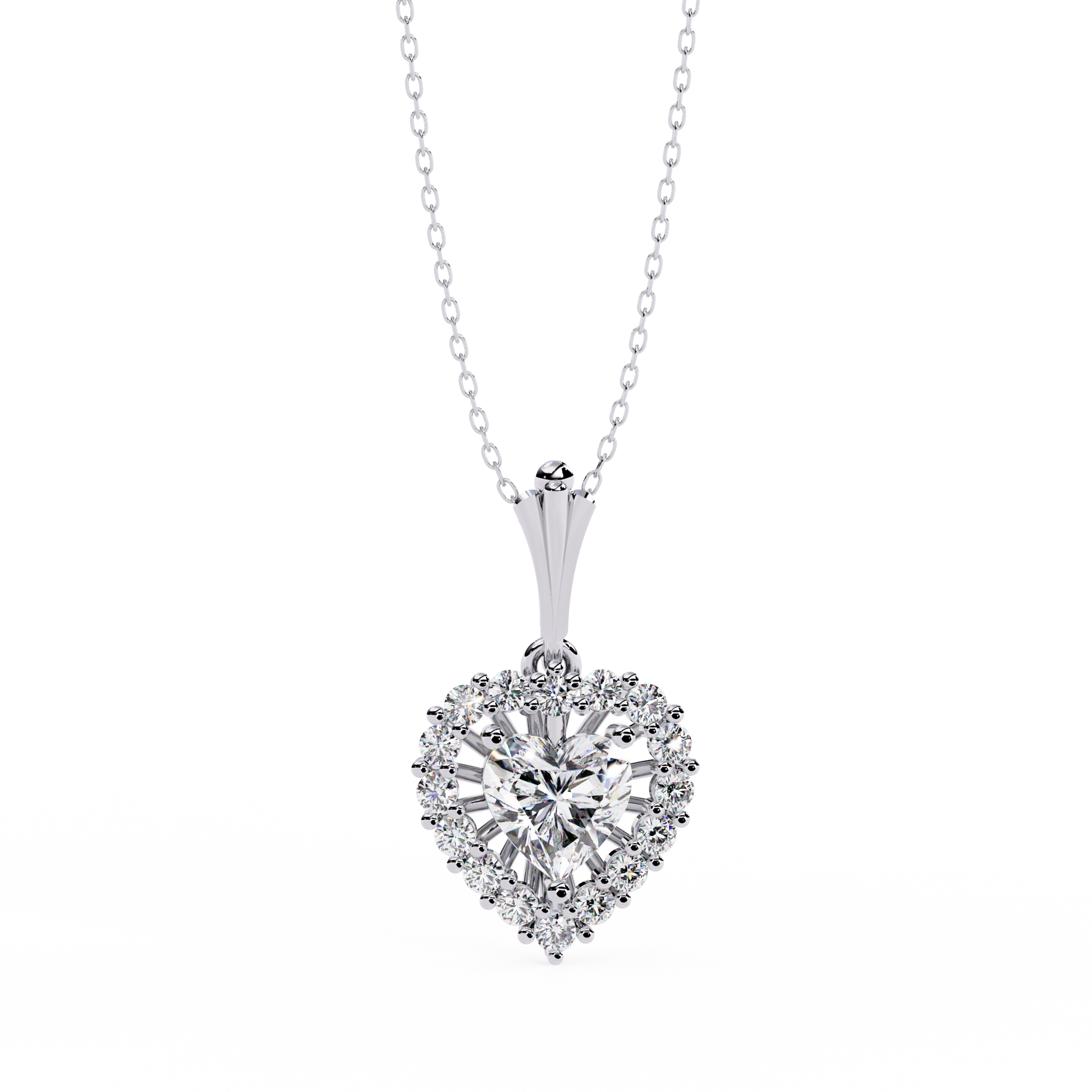 A modern love token with couture sparkle. This pendant showcases a 2.00 ct heart-cut center stone wrapped in a brilliant round halo and a sculpted, open sunburst gallery that floods the gem with light. Elegant proportions keep it dressy yet wearable every day.