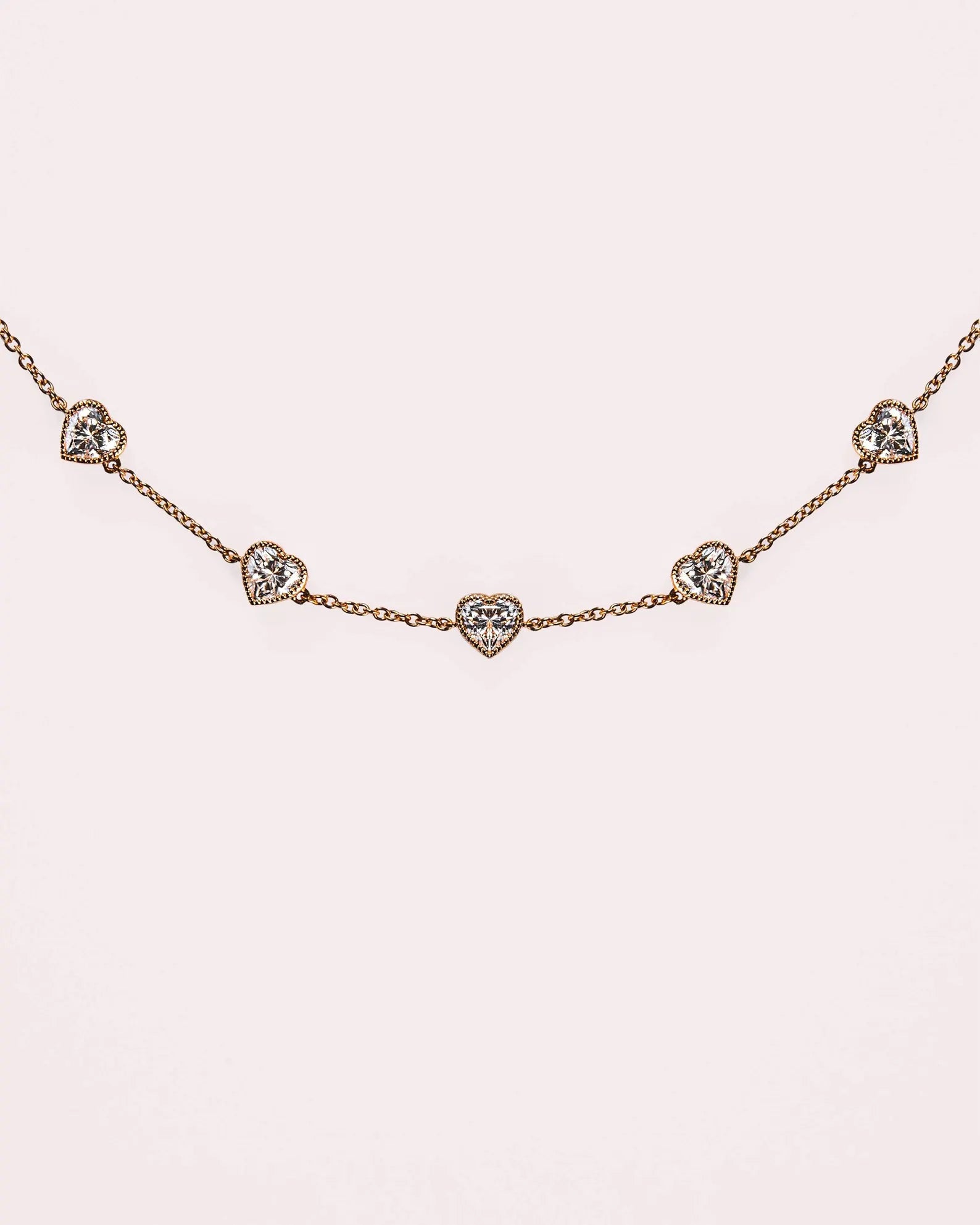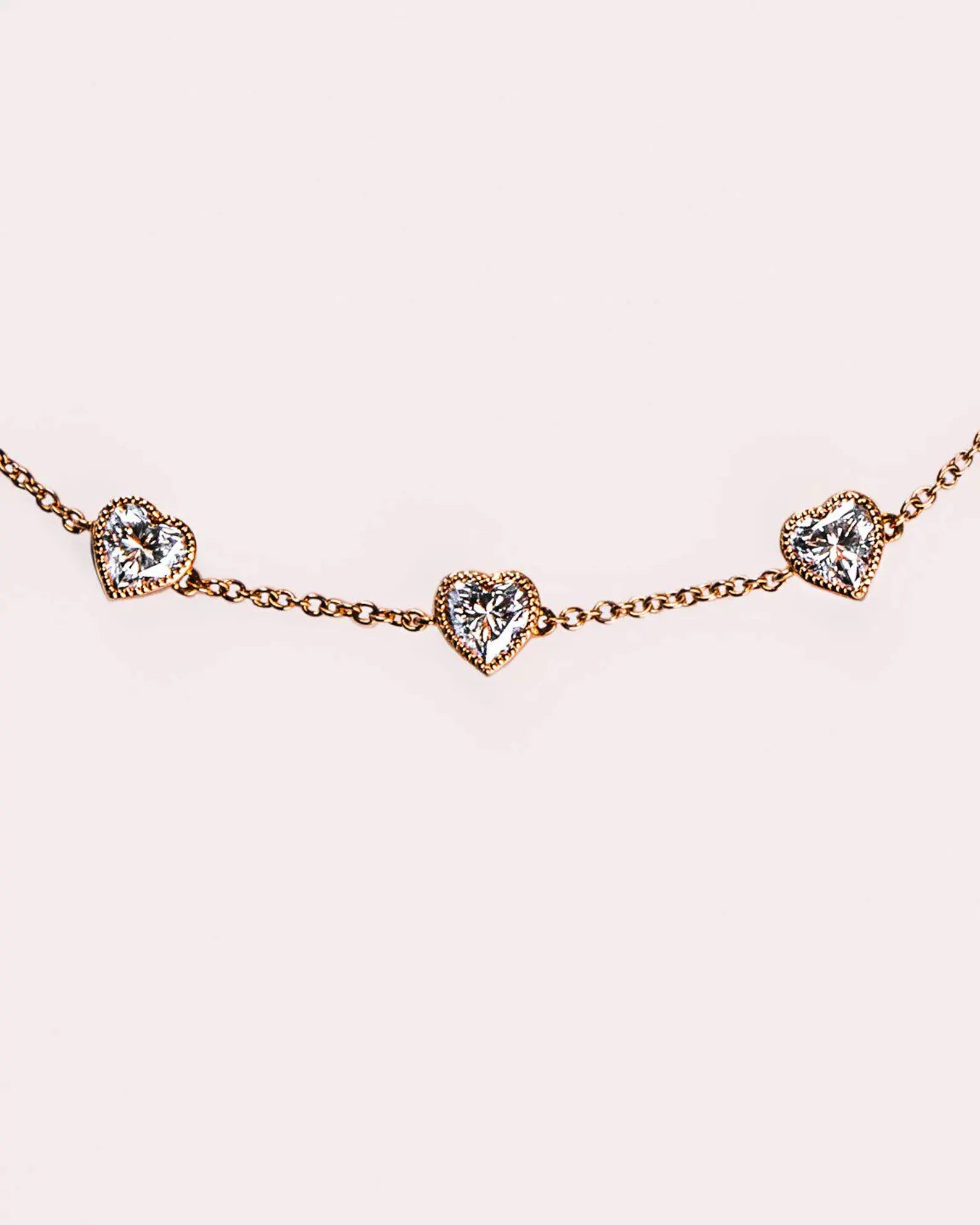 This delicate and romantic bracelet features five beautifully bezel-set 4mm Heart-Shaped Diamonds, available in either fiery Moissanite or premium Lab-Grown Diamonds — offering you a timeless and elegant piece that’s perfect for daily wear or meaningful gifting.