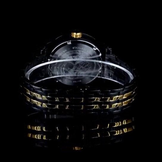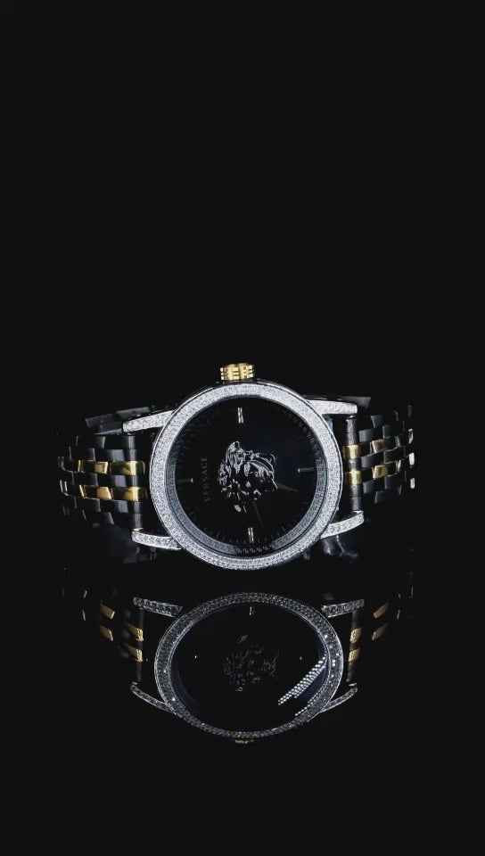 Make a powerful statement with this Luxury Two-Tone Lion Dial Watch. Featuring a striking lion head design at the center, this timepiece radiates confidence and style. The dazzling diamond-studded bezel paired with a sophisticated black and gold stainless steel band gives it a high-end, Versace-inspired aesthetic. Built with scratch-resistant glass and a precision quartz movement, this watch is as durable as it is stylish. Whether you're dressing up for a night out or looking for a standout gift, this watch delivers bold elegance with every tick.