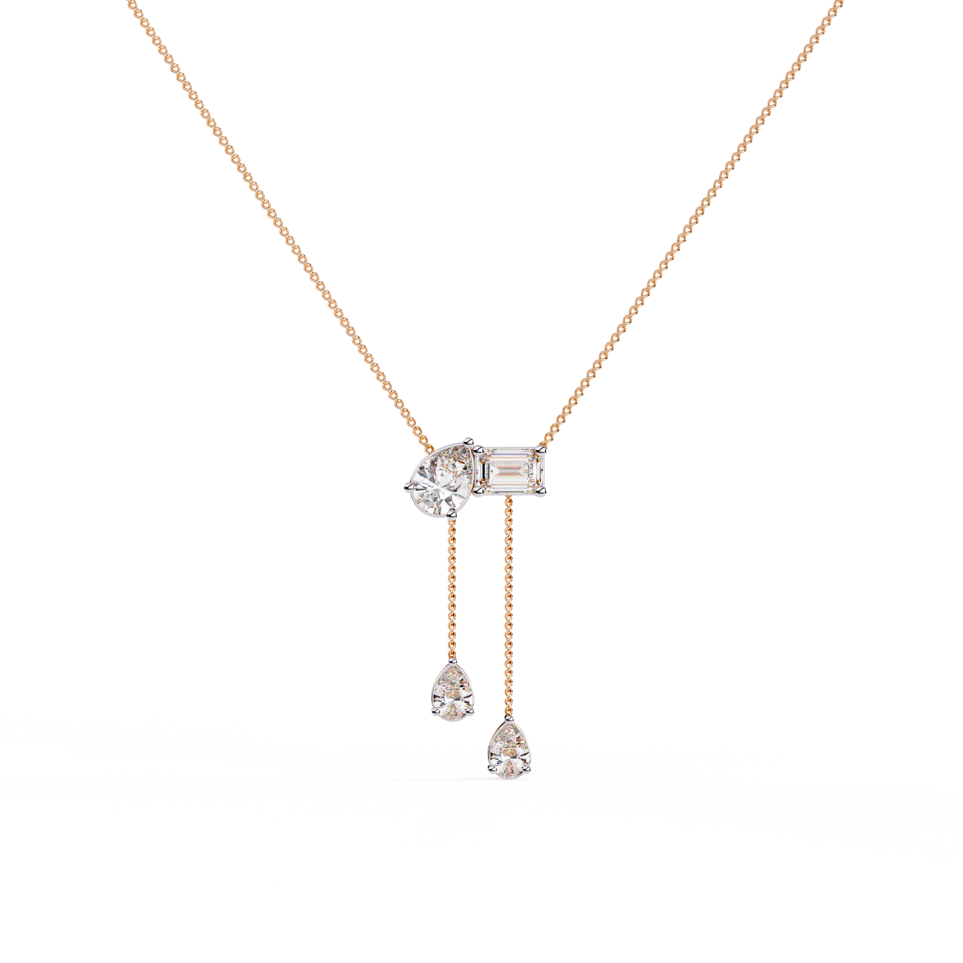 • Sleek Y-drop silhouette with a trio of stones: pear + emerald-cut + twin pear drops for airy movement and sparkle.